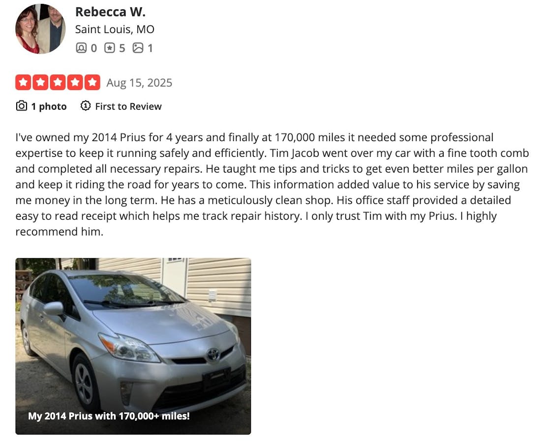 For someone who is honest and charges a fair price, Tim Jacob at Jacob Automotive LLC is your guy." - John Ruiseco Nixa, Missouri